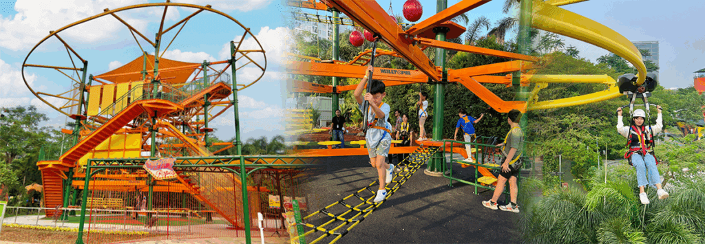 Activities are a major highlight, ranging from animal interactions to adventure sports. Visitors can feed koi fish, meet rabbits at Bunnyville, or explore Petopia and Teepee Barn where animals such as alpacas and deer can be encountered up close. For more active pursuits, there are facilities like wall climbing, skate parks, street workout areas and the Adventure Ropes course—an outdoor rope and roll-glider experience. Children can also enjoy water play at O’Splash or take a ride on the SQP Express mini train around the park.